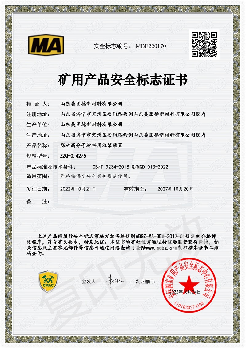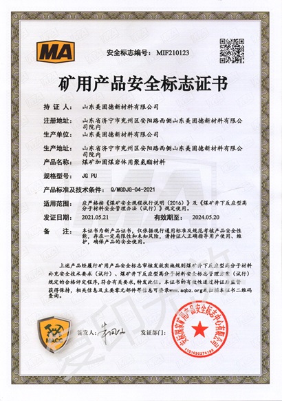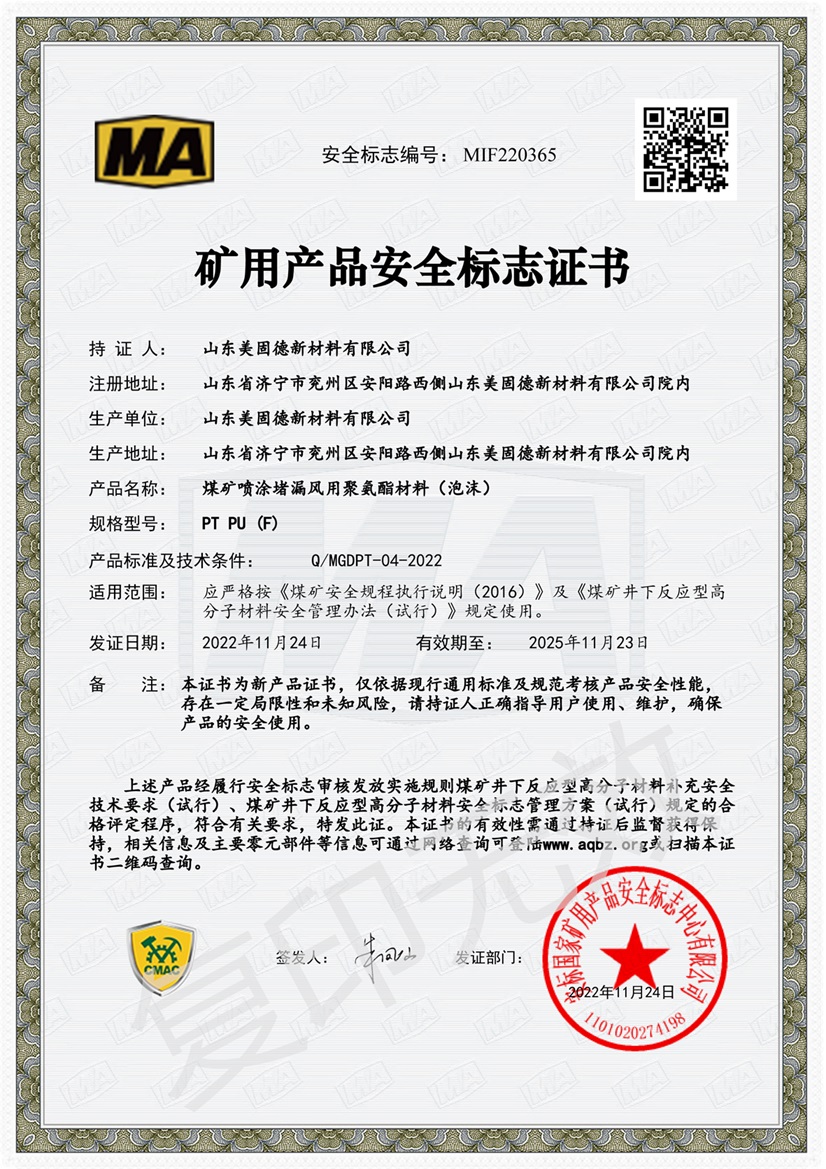 美固徳 封孔产品:瓦斯抽放孔及各种钻孔的快速密封和固定